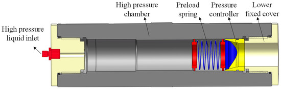 Experimental Objectives: (1) To evaluate the sealing capacity of the pressure controller through hydraulic loading tests and (2) to analyze the sealing contact characteristics by conducting morphological examination of the sealing interface after hydraulic loading. The complete test system comprises an external hydraulic testing platform and a high-pressure test chamber assembly [32]. As illustrated in Figure 17, the high-pressure test chamber assembly includes the following components: high-pressure cavity, high-pressure fluid inlet, preload spring, pressure controller, and lower fixed end cap. The pressure controller is installed within the high-pressure chamber body. The preload spring is compressed to provide the initial sealing force required for the pressure controller, while the lower fixed end cap secures the controller within the chamber. As shown in Figure 18, the high-pressure test chamber is connected to the hydraulic testing platform. Hydraulic fluid is injected into the chamber through the high-pressure inlet, with pressure incrementally increased to validate the sealing capability of the pressure controller.