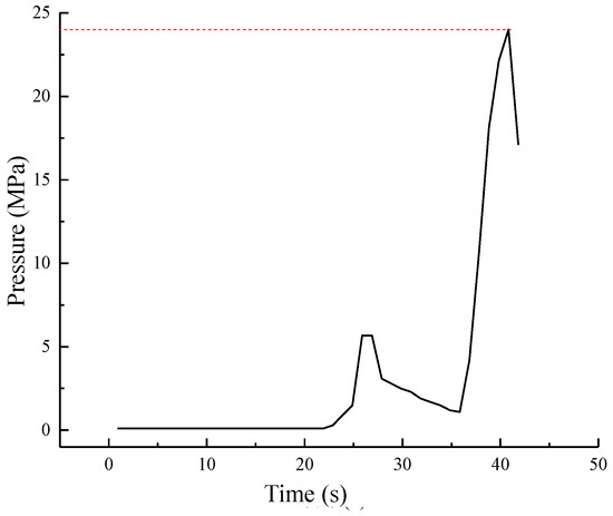 Figure 20 presents the hydraulic loading curve recorded during the experimental procedure. During the initial stage of stepwise pressurization to 5 MPa, a pressure drop phenomenon was observed due to either minor misalignment between the valve cover and valve seat, or minimal leakage from the sealing ring. Upon reaching approximately 24 MPa, a pressure drop was observed followed by pressure stabilization failure, indicating significant leakage occurrence that necessitated test termination. The observed leakage pressure is closely aligned with the maximum sealing capacity of the pressure controller as defined through numerical simulation, which validates the effectiveness of both the simulation methodology and experimental testing approach.