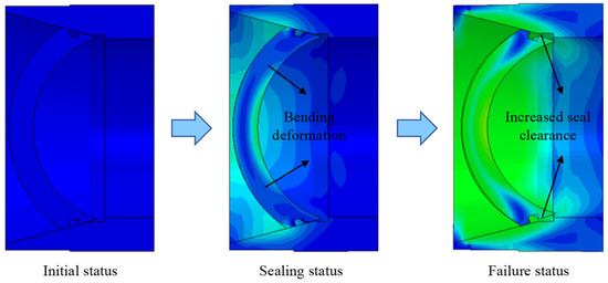 Figure 22 illustrates the extrusion failure zones of the seal ring, which are predominantly located at the lower boundaries of the lower sealing contact regions. This phenomenon occurs due to significant bending deformation of the valve cover under high hydraulic loading, resulting in disengagement of the metal sealing surfaces and subsequent enlargement of the sealing gap. When this deformation exceeds the design limits of the seal, extrusion failure of the O-ring is observed. This deformation mechanism is fully consistent with the simulation process illustrated in Figure 23.