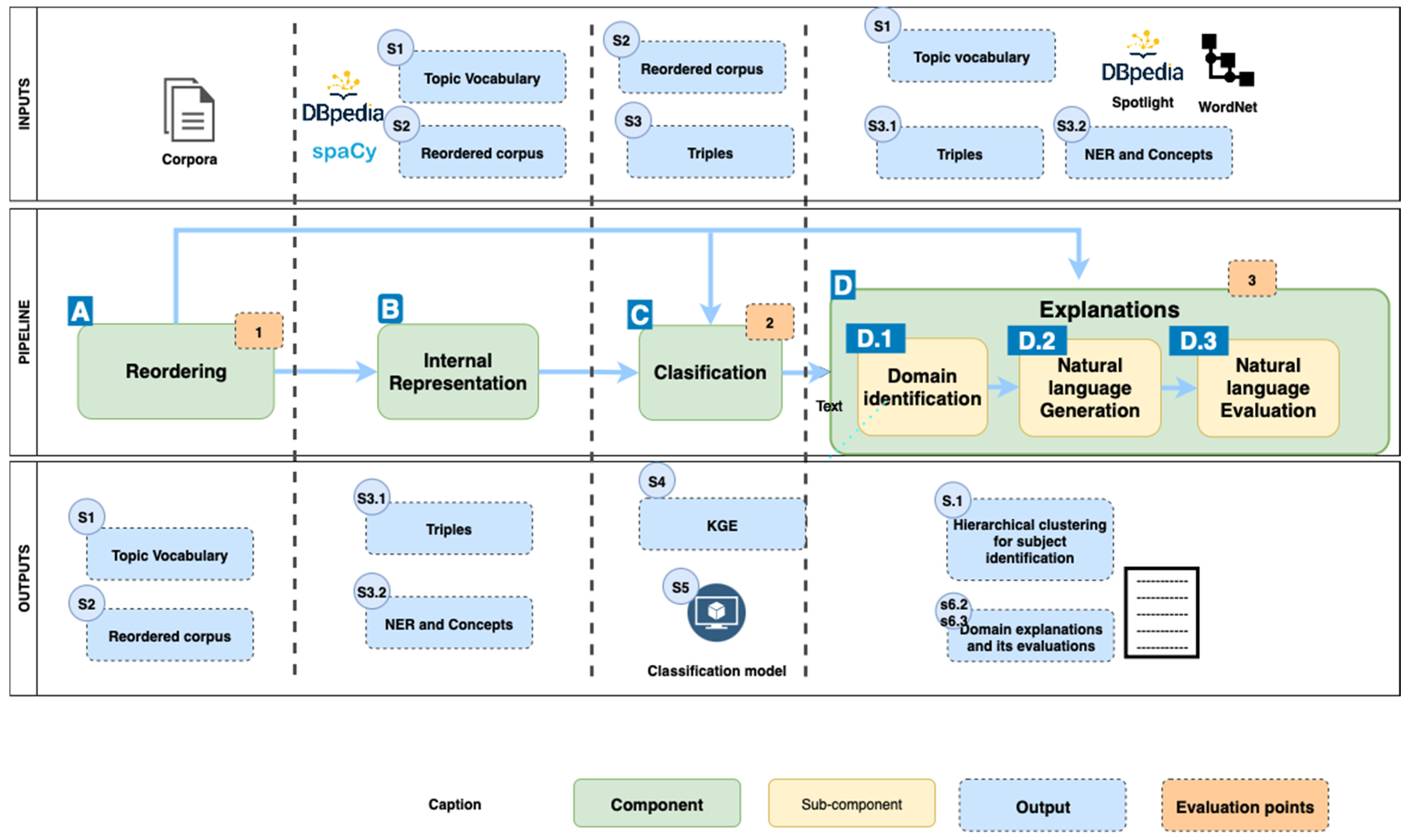 - This study demonstrates that the OBOE framework principles can be extended to solve a fundamentally different problem from its original design. While the original OBOE framework explains a text classification decision based on text, our work establishes a novel XAI paradigm that addresses two interrelated challenges: (1) the explainable classification of knowledge graphs derived from text; (2) the unsupervised discovery and explanation of semantic domains within these graphs to ease the understanding of this classification.