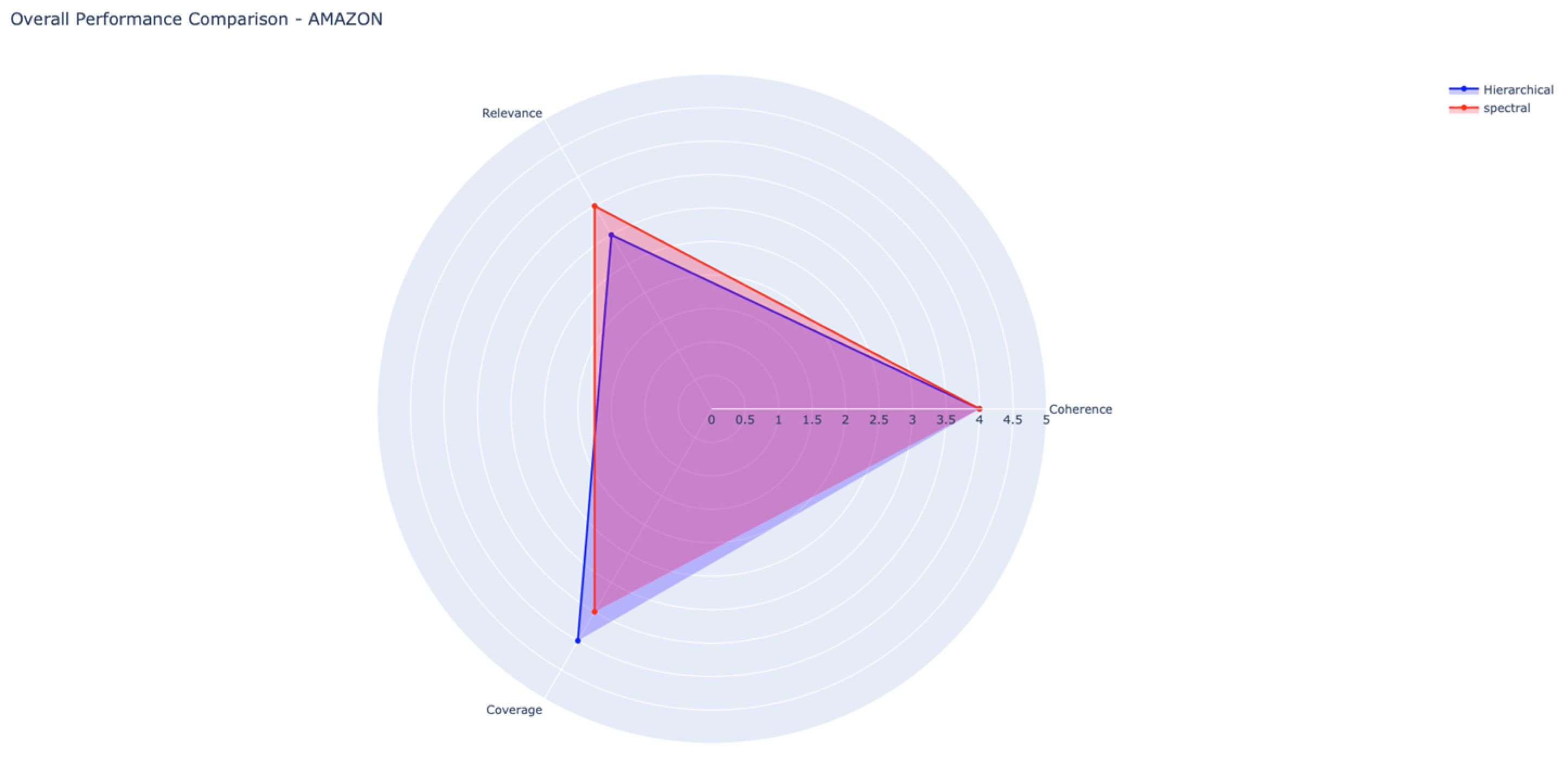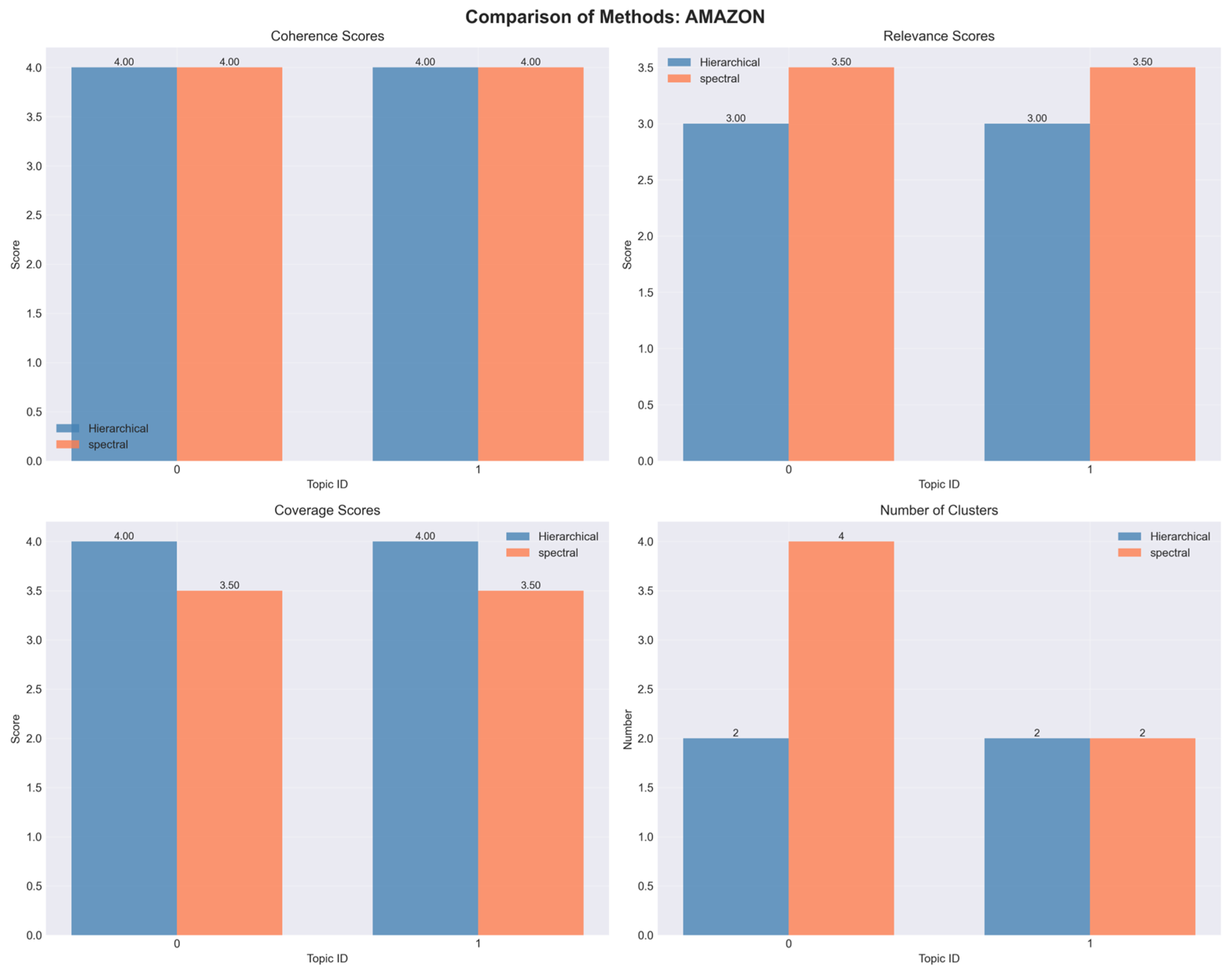 | Amazon | Hierarchical | 4.00 ± 0.00 | 3.00 ± 0.00 | 4.00 ± 0.00 | 3.67 | Broader topical scope; coherent but less domain-focused. |