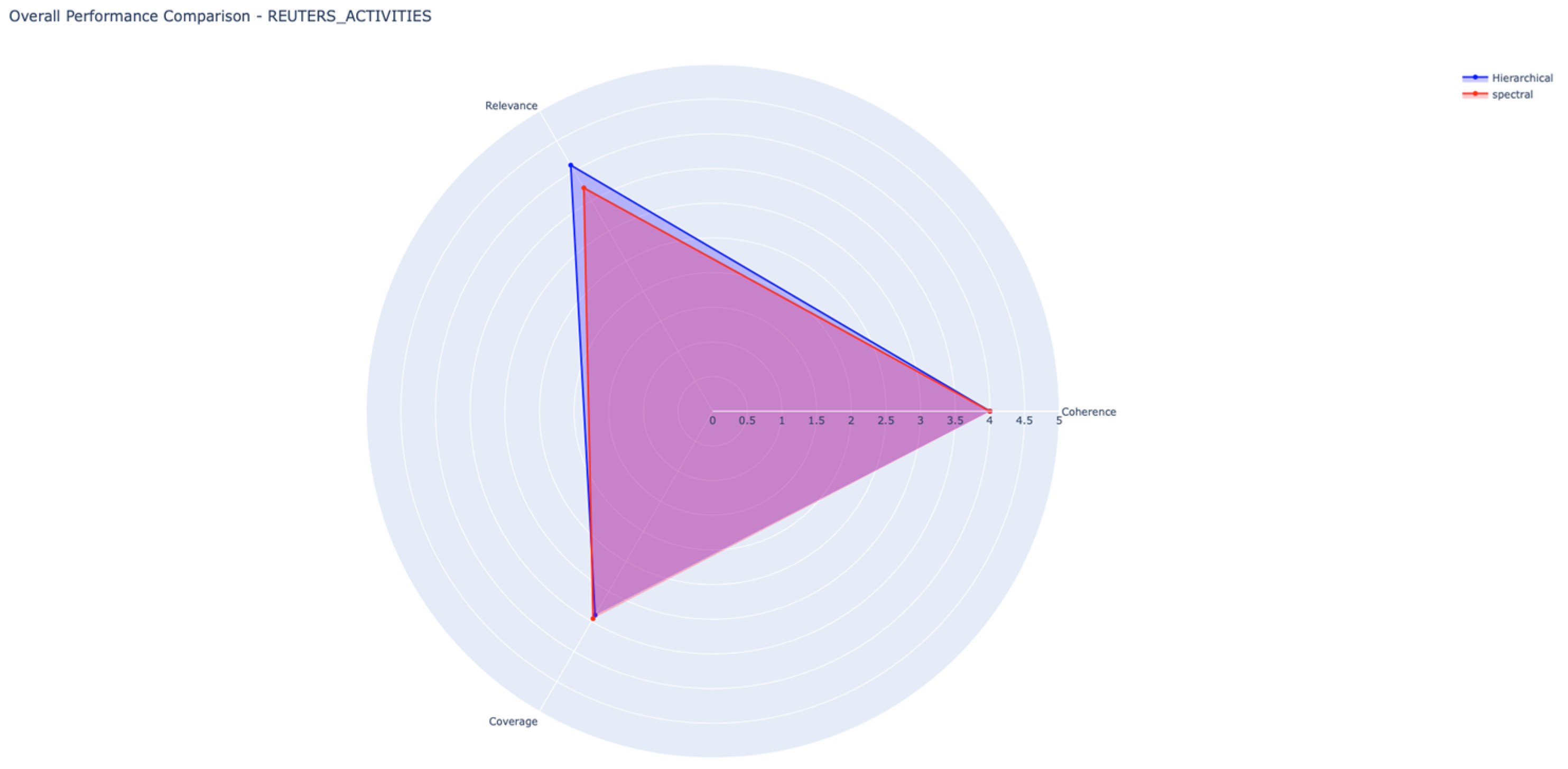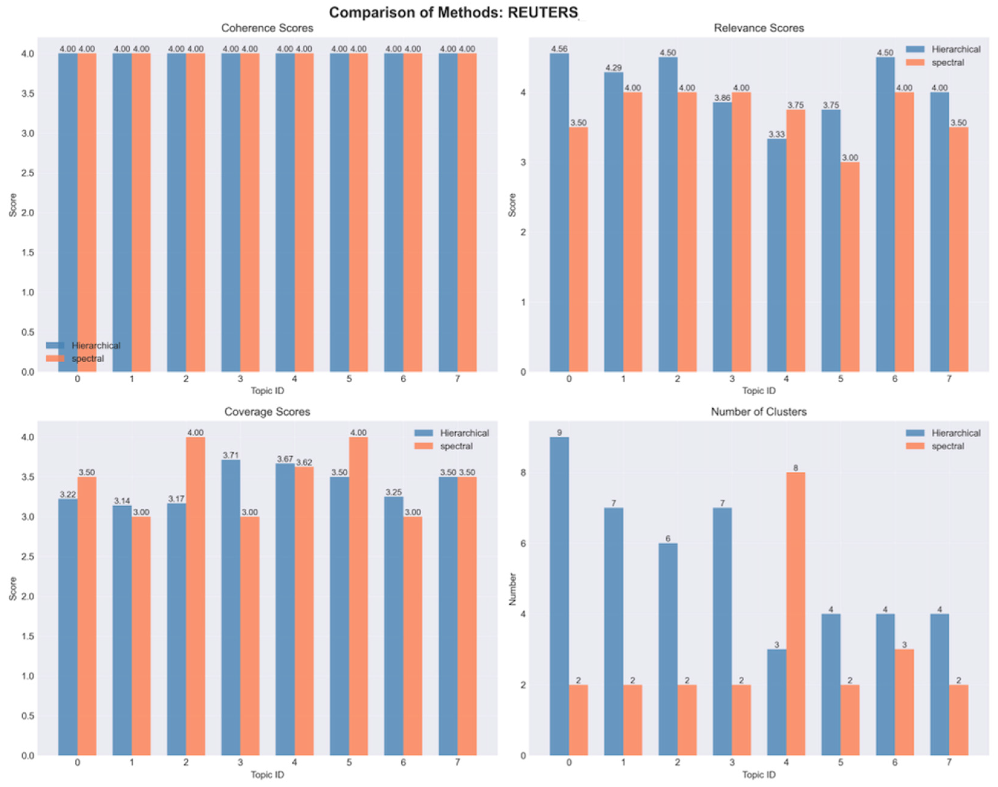 | Reuters | Hierarchical | 4.00 ± 0.00 | 4.10 ± 0.44 | 3.40 ± 0.23 | 3.83 | Domain fidelity and semantic stability. |