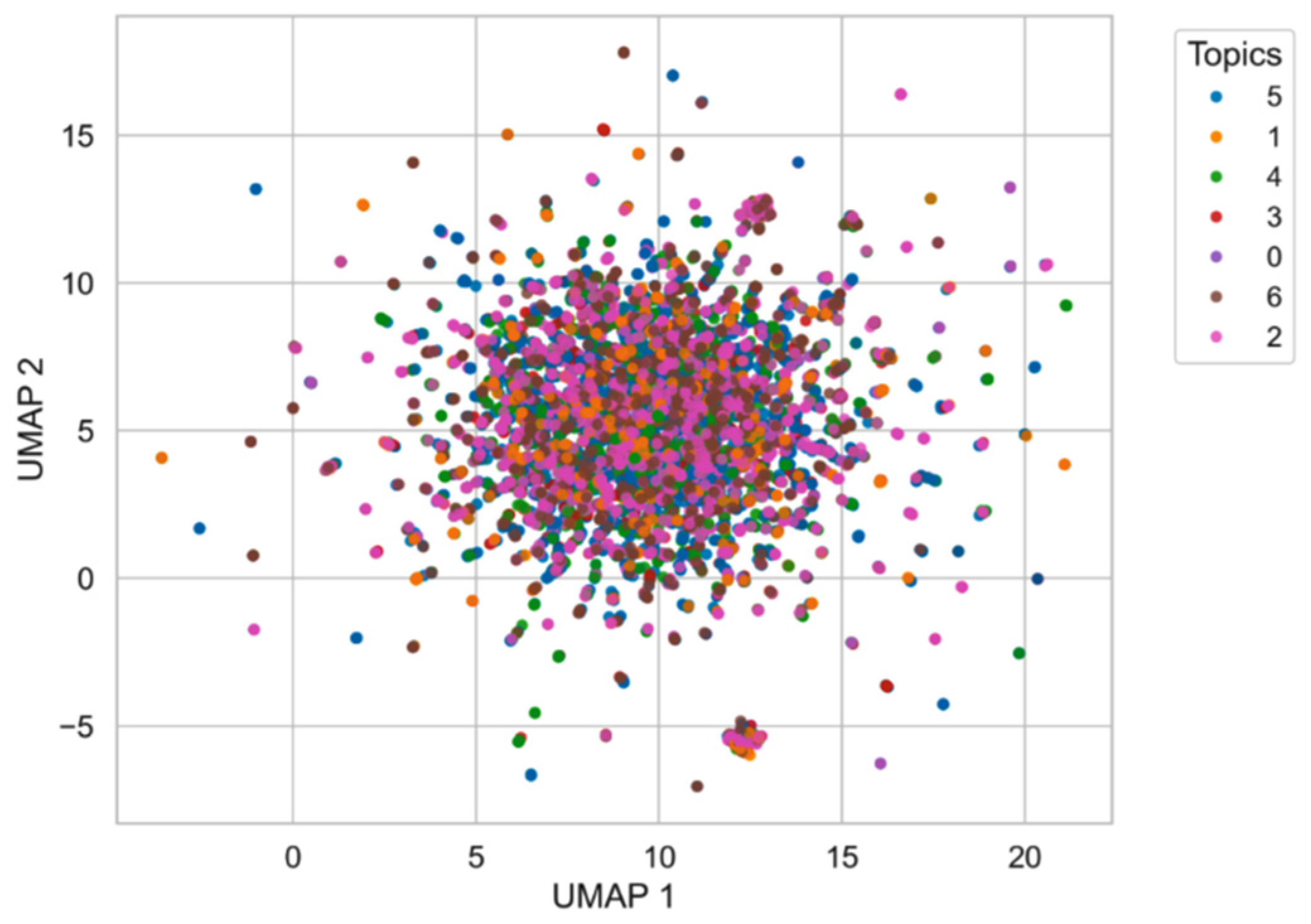 - Röder, M.; Both, A.; Hinneburg, A. Exploring the Space of Topic Coherence Measures. In Proceedings of the Eighth ACM International Conference on Web Search and Data Mining, Shanghai, China, 2–6 February 2015; Association for Computing Machinery: New York, NY, USA, 2015; pp. 399–408. [Google Scholar]