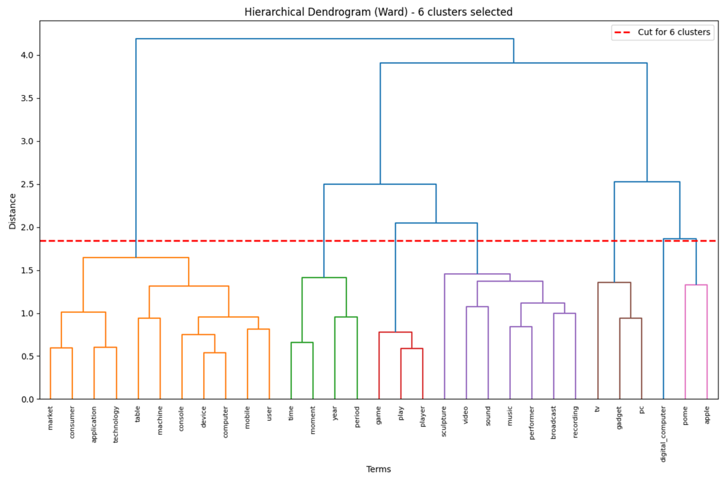 - Hierarchical clustering (Ward linkage) groups conceptually related terms into domains, enabling analysis of inter-domain relationships through dendrograms and facilitating identification of multiple granular domains within single topics.