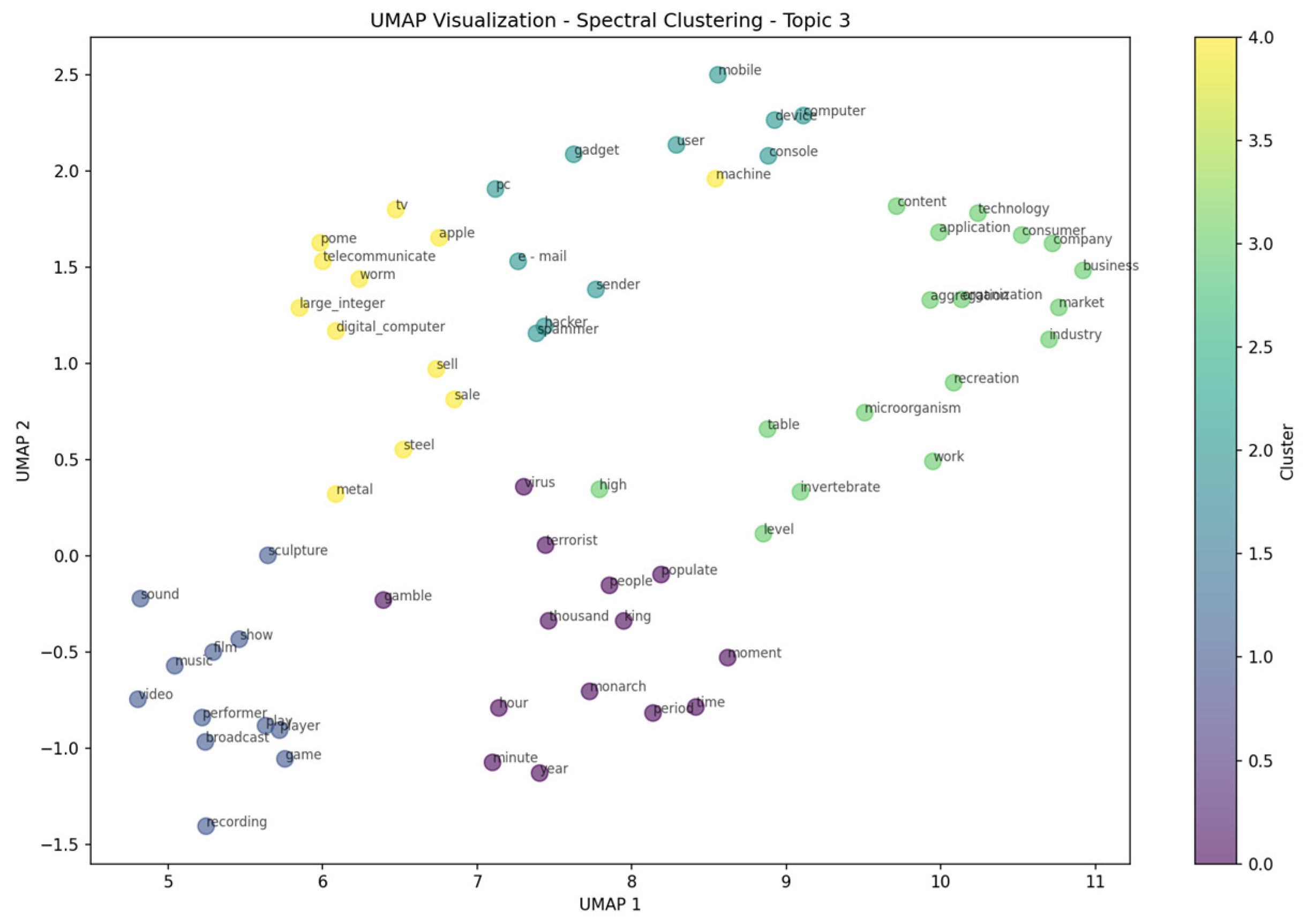 - Spectral clustering to capture non-convex semantic structures, where similarity scores are normalized to the [0, 1] range to form an affinity matrix. Spectral clustering applies eigen decomposition of the graph Laplacian to project terms into a lower-dimensional spectral space, where standard clustering algorithms can identify semantically coherent groups.