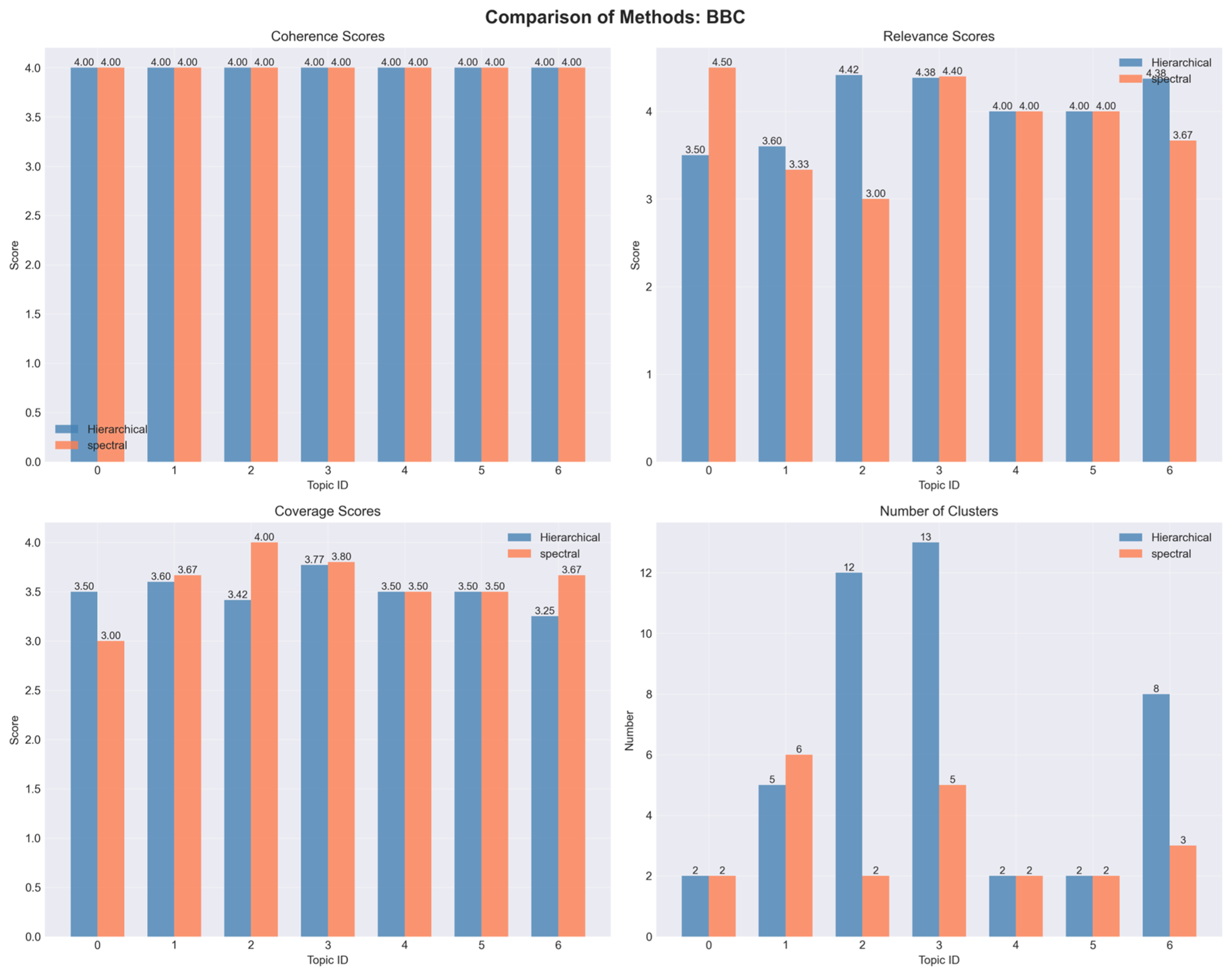 | Spectral | 4.00 ± 0.00 | 3.72 ± 0.36 | 3.45 ± 0.42 | 3.72 | Good local coherence; narrower topical scope. | |
