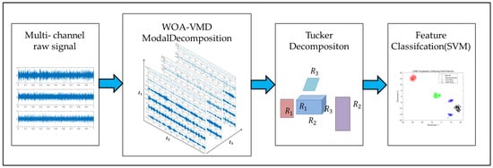 In this study, five bearing conditions were established, including normal, inner race fault, outer race fault, rolling element fault, and compound fault. The proposed method integrates VMD and Tucker decomposition to extract fault features from multi-channel vibration signals. The multi-channel IMFs obtained through VMD are used to construct a high-order tensor, which preserves both spatial and temporal information. Tucker decomposition is then applied to extract compact and discriminative features from the constructed tensor. To enhance the accuracy and adaptability of signal decomposition, the WOA is introduced to optimize the key VMD parameters, including the mode number and penalty factor. Finally, statistical features such as kurtosis, standard deviation, and waveform factor are calculated from the factor matrices and fed into a Support Vector Machine (SVM) classifier to achieve accurate identification of different bearing fault types (Figure 2).