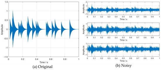 (a) Original signals without noise; (b) signals after noise addition with signal-to-noise ratios (SNR) of −10 dB, −8 dB, and −5 dB from top to bottom.