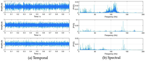 Taking the ball fault signal as an example, Figure 5a,b show the time-domain waveform and frequency spectrum, respectively. As seen in Figure 5a, the waveform does not present obvious fault-related features. In the frequency spectrum shown in Figure 5b, the fault-related frequency components vary significantly across channels due to the influence of background noise and signal transmission paths. In particular, the first channel lacks clearly identifiable fault frequencies.