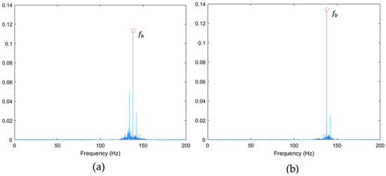 In Figure 6a, the frequency spectrum obtained using standard VMD still retains some interference-related frequency components. In contrast, the WOA-optimized VMD method shown in Figure 6b exhibits a cleaner spectrum with nearly no visible interference frequencies, and the fault-related frequencies are more distinctly highlighted. The marked frequency represents the characteristic fault frequency of the rolling bearing.