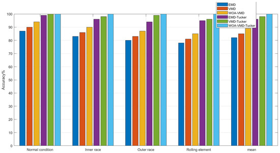 To further verify the effectiveness of the proposed WOA-VMD-Tucker multi-channel feature extraction method, six methods, EMD, VMD, WOA-VMD, EMD-Tucker, VMD-Tucker, and the proposed WOA-VMD-Tucker, were selected for comparison. Classification accuracy was evaluated under four operating conditions: normal, inner ring fault, outer ring fault, and rolling element fault. Each method was trained multiple times, and the average accuracy was calculated. The results are shown in Figure 7.