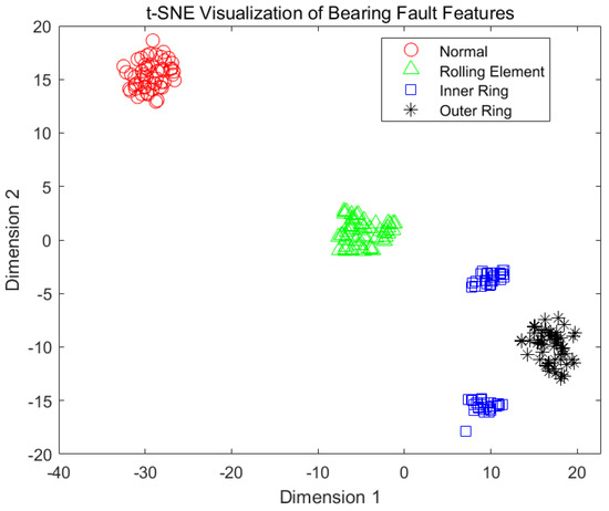 t-SNE scatter plot of bearing fault features obtained using the proposed method.