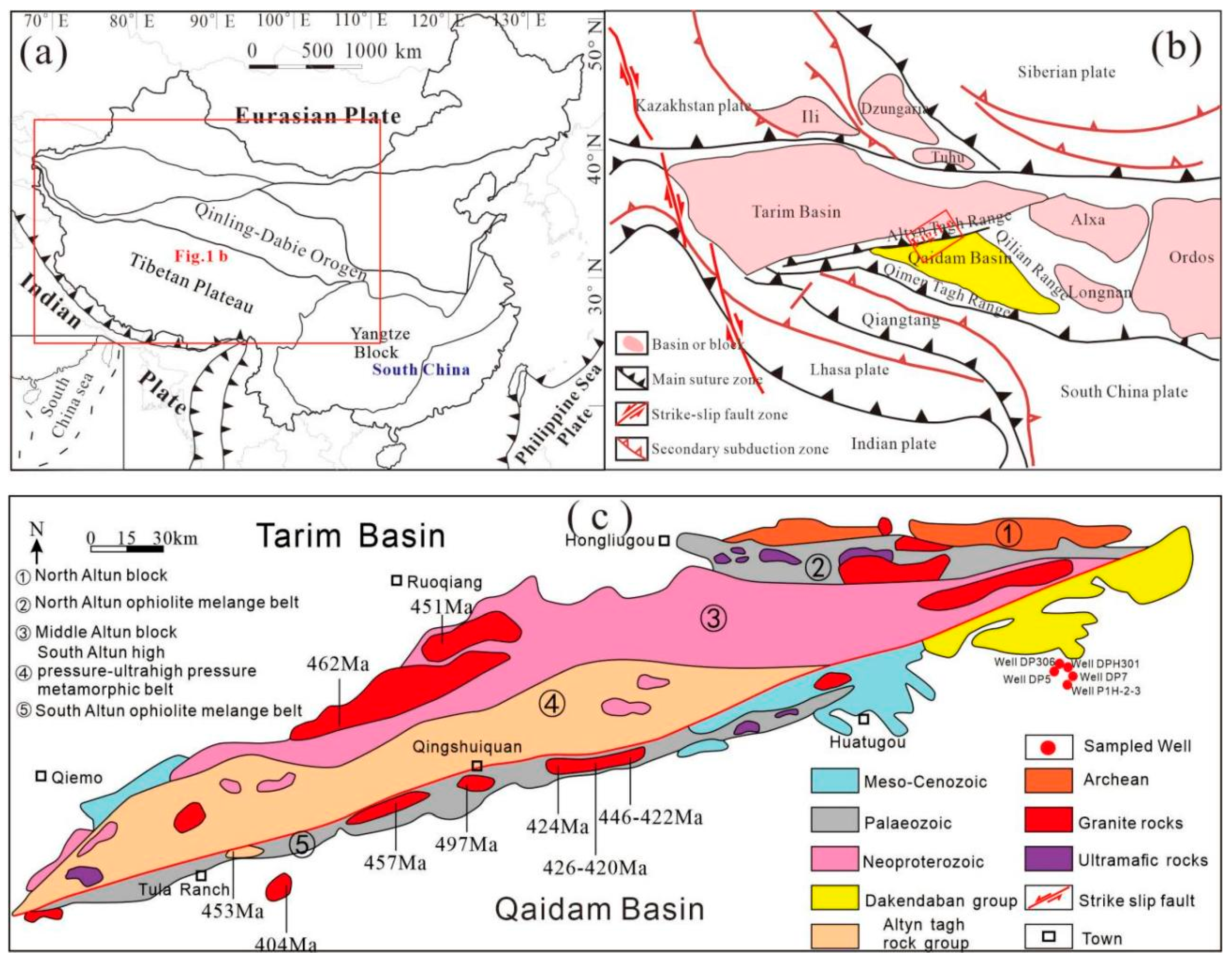 - Wu, C.L.; Chen, H.J.; Wu, D.; Ernst, W.G. Paleozoic granitic magmatism and tectonic evolution of the South Altun block, NW China: Constraints from zircon U-Pb dating and Lu-Hf isotope geochemistry. J. Asian Earth Sci. 2018, 160, 168–199. [Google Scholar] [CrossRef]