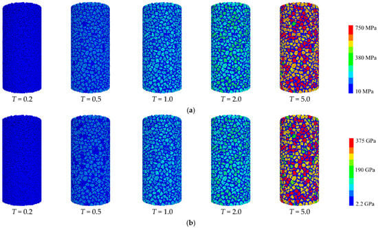 Figure 8 displays the stress–strain curves of specimens with varying intragranular contact micro-moduli. All curves follow consistent evolutionary patterns, delineated into elastic, damage, and post-peak stages. With increasing scaling factor T, the peak stress demonstrates a significant reduction, while the slope of the elastic deformation stage exhibits moderate enhancement. This reveals a negative correlation between intragranular contact micro-modulus and the specimen’s overall bearing capacity, but a positive correlation with its deformation resistance.