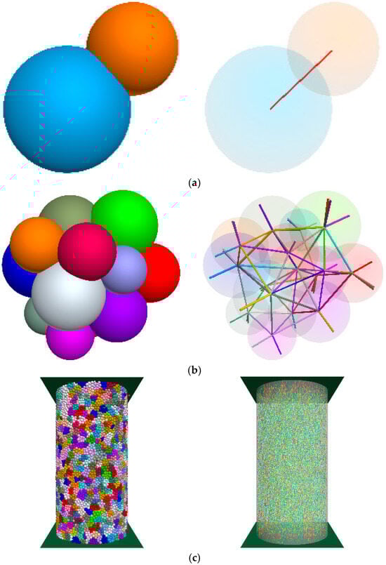 At the microscale, as illustrated in Figure 4a, a force chain forms between two adjacent basic units, where bond fracture and subsequent micro-crack initiation occur when the force chain magnitude exceeds the contact bond’s micro-strength, with the force chain orientation aligning with the centroidal axis of the units. At the mesoscale, as illustrated in Figure 4b, loading on a particle cluster generates a relatively complete internal force chain network whose configuration governs the cluster’s fracture behavior. At the macroscale, as shown in Figure 4c, specimen loading develops a comprehensive force chain network dictating both mesoscopic and macroscopic failure mechanisms [].