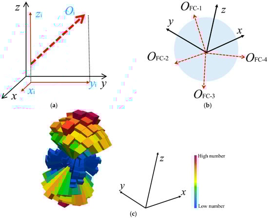 This study employs 3D rose diagrams to visualize force chain orientations. As shown in Figure 5a, the orientation vector Oi of any force chain in 3D space is defined by its Cartesian components xi, yi, and zi. Custom algorithms statistically process these components across all force chains to determine orientations. Represented as unit vectors, as shown in Figure 5b, all orientation vectors terminate on a unit sphere centered at the coordinate origin, with axes aligned to the specimen’s global coordinates. The resulting rose diagram, as shown in Figure 5c, displays force chain orientations where column height and color intensity quantitatively reflect force chain density per orientation bin, maintaining consistent coordinate alignment across all diagrams [].
