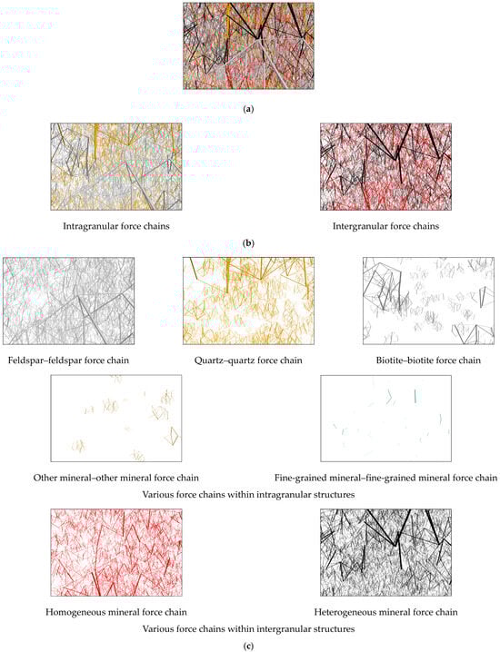 Regarding hierarchical classification, the force chains within the model are categorized according to contact types, establishing a multi-tiered system—primary force chains (all force chains), secondary force chains (intragranular and intergranular force chains), and tertiary force chains (intragranular: feldspar–feldspar, quartz–quartz, biotite–biotite, other mineral–other mineral, fine-grained mineral–fine-grained mineral; intergranular: homogeneous mineral and heterogeneous mineral force chains)—as shown in Figure 6.