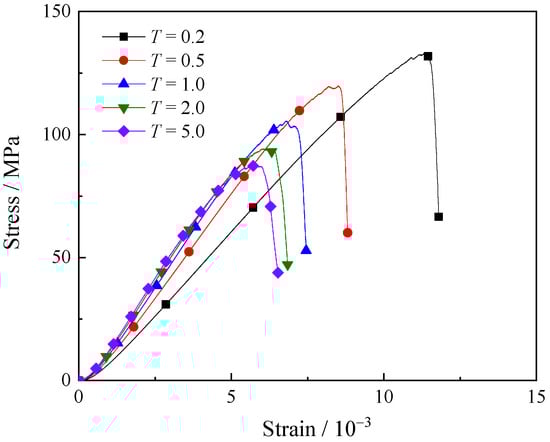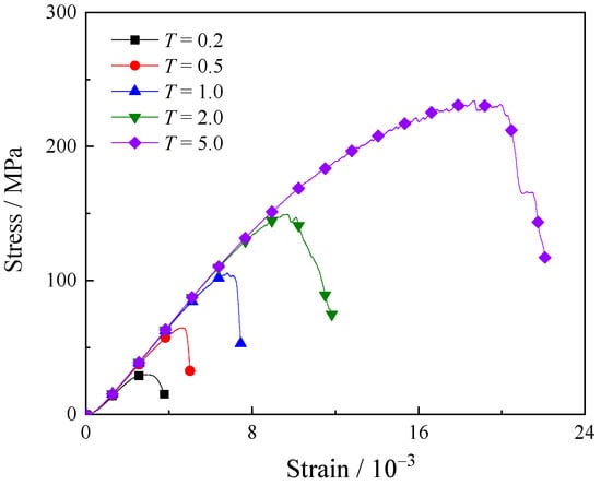 Figure 7 presents the stress–strain curves of specimens with varying intragranular contact micro-tensile strengths. All curves exhibit consistent evolutionary trends, characterized by three distinct stages: elastic stage, damage stage, and post-peak stage. With increasing scaling factor T, the peak stress demonstrates significant enhancement, accompanied by a pronounced rise in the slope of the elastic deformation stage. Hence, the micro-strength of intragranular contacts exhibits a positive correlation with the specimen’s overall bearing capacity and deformation resistance.