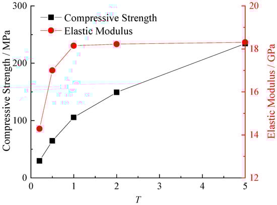 As illustrated in Figure 9, the compressive strength and elastic modulus of specimens exhibit distinct evolutionary trends with increasing intragranular contact micro-tensile strength. As scaling factor T rises from 0.2 to 5.0, compressive strength demonstrates substantial growth from 29.7 MPa to 234.2 MPa. Concurrently, the elastic modulus rapidly increases from 14.3 GPa to 18.1 GPa before transitioning to a gradual rise, ultimately stabilizing at 18.3 GPa.