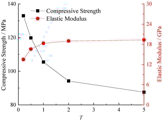 Figure 10 depicts the evolution of compressive strength and elastic modulus in specimens with varying intragranular contact micro-moduli. As scaling factor T increases from 0.2 to 5.0, compressive strength demonstrates a significant decline from 133.0 MPa to 87.5 MPa, while the elastic modulus rapidly rises from 13.5 GPa to 18.1 GPa before transitioning to a gradual increase, ultimately stabilizing at 19.3 GPa.