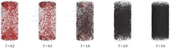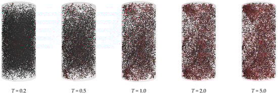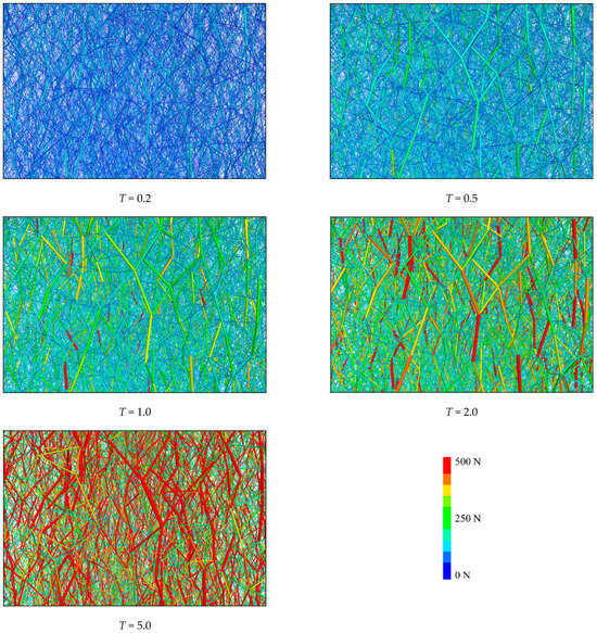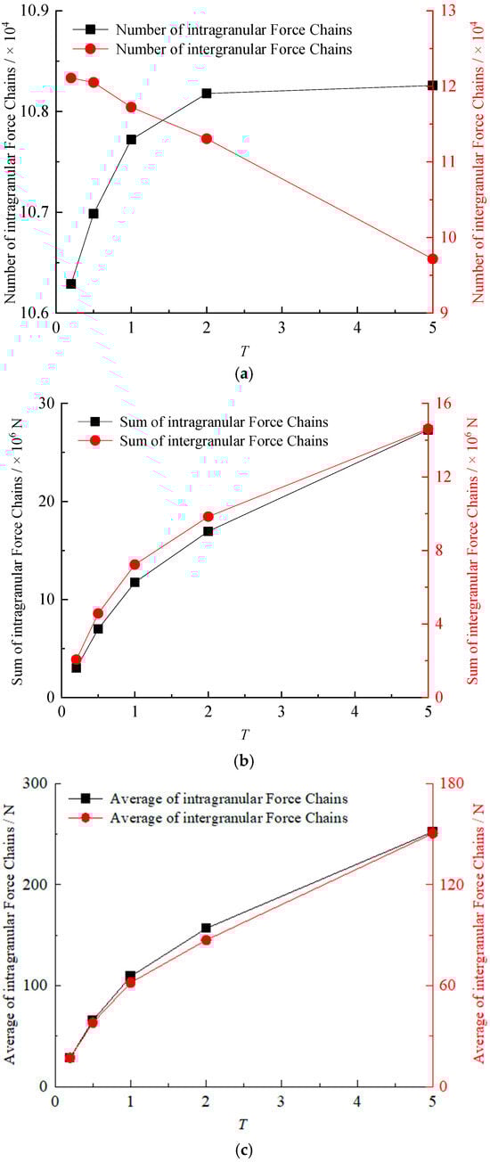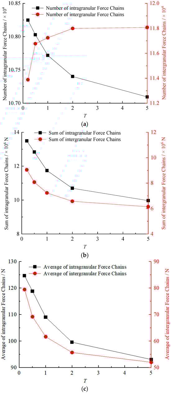 Quantitative analysis of intragranular and intergranular force chains evaluates three metrics: number of granular force chains, sum of granular force chains, and average granular force chains. As depicted in Figure 16, when T increases from 0.2 to 5.0, the intragranular number of granular force chains rises from 10.63 × 104 to 10.83 × 104, an increase of 1.85%, while the intergranular number of granular force chains declines from 12.11 × 104 to 9.72 × 104, a decrease of 19.76%. The intragranular sum of granular force chains surges from 3.00 × 106 N to 27.30 × 106 N, an increase of 808.78%, whereas the intergranular sum of granular force chains increases from 2.06 × 106 N to 14.62 × 106 N, an increase of 608.85%. Meanwhile, the intragranular average granular force chains rise from 28.26 N to 252.15 N, an increase of 792.25%, and the intergranular average granular force chains increase from 17.03 N to 150.43 N, an increase of 783.44%.