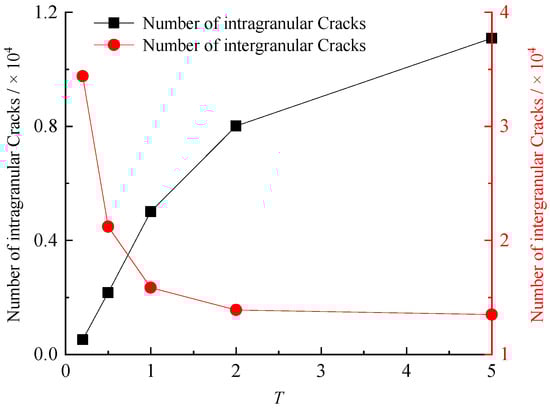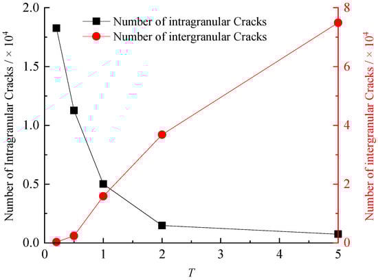 Figure 13 displays fracture nephograms under varying intragranular contact micro-moduli. The dominant coloration shifts from black to red with increasing T, revealing that lower micro-moduli suppress intragranular cracking. Conversely, rising micro-moduli progressively intensify intragranular fracture. Quantitative data in Figure 14 confirm this mechanism: as T escalates from 0.2 to 5.0, intragranular cracks increase from 520 to 11,091, while intergranular cracks decrease from 34,394 to 13,500.