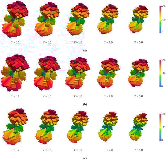 Figure 15 displays high-strength force chain rose diagrams for specimens with varying intragranular contact micro-tensile strengths at peak load, where increasing scaling factor T visibly expands the diagram volume and induces a chromatic shift from blue to yellow–red, signifying substantial growth in HF density.