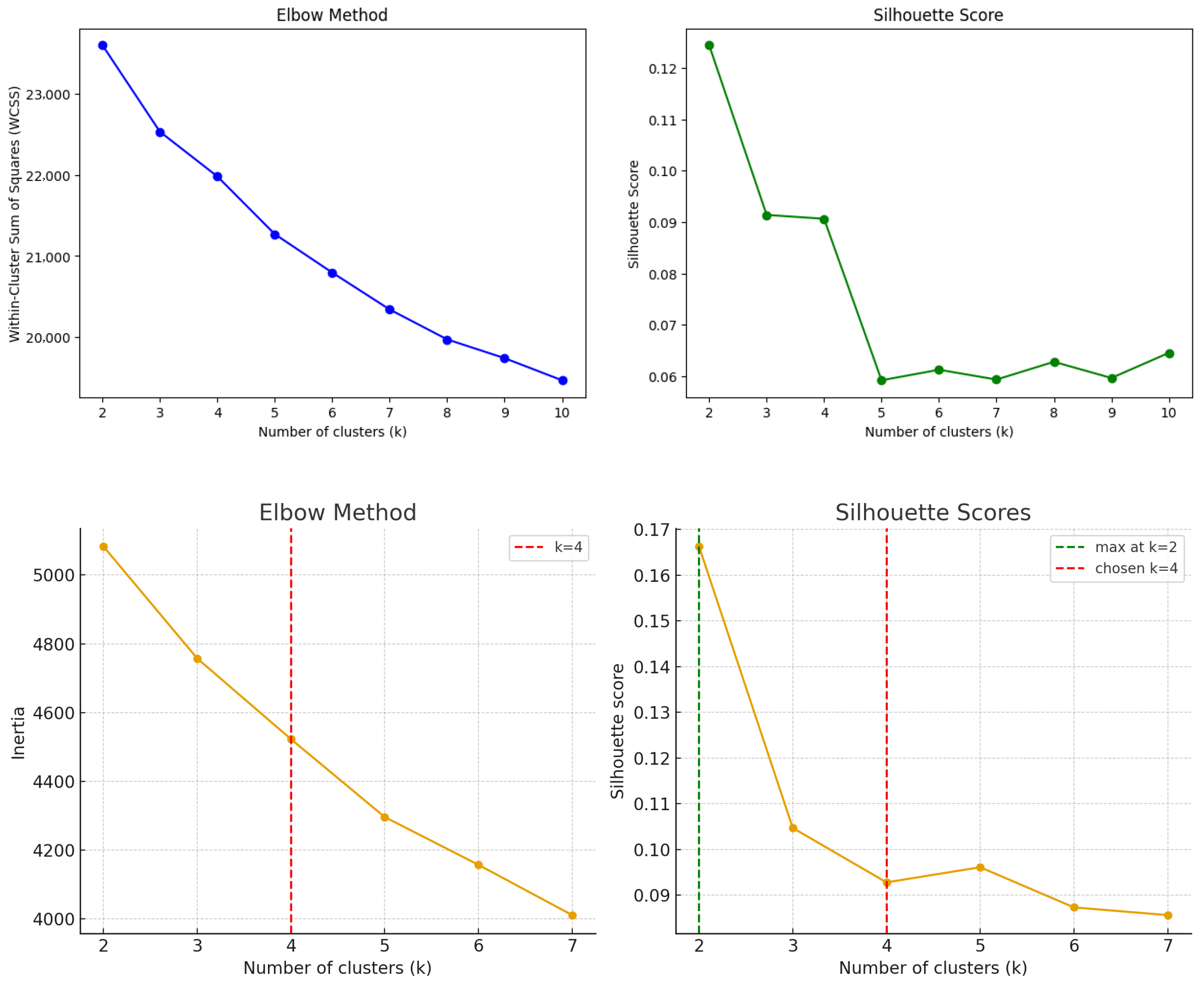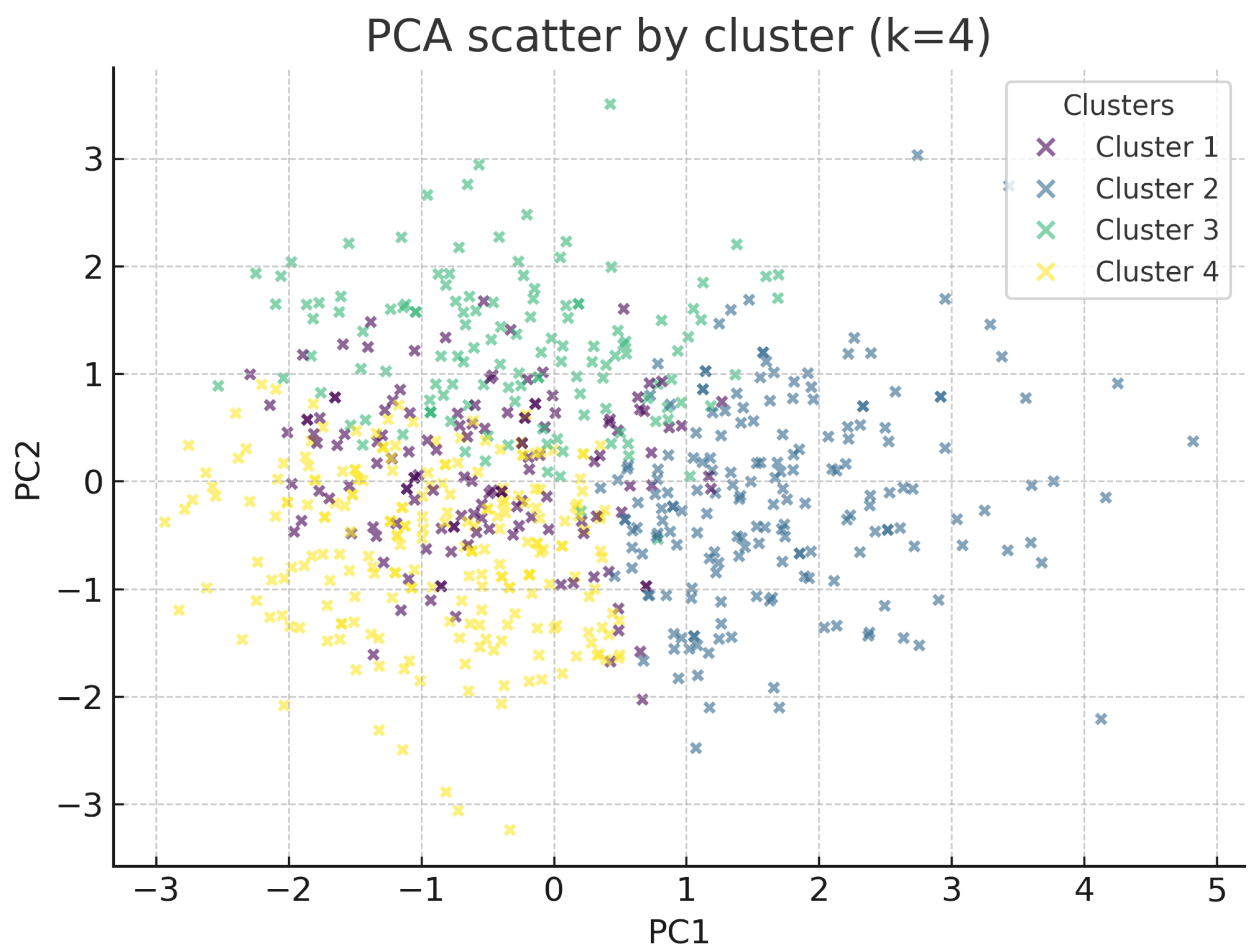 Although the silhouette coefficient slightly increased again for , that solution produced an additional split within the high-engagement group without improving the interpretability or balance of cluster sizes. Therefore, the solution was retained as theoretically meaningful, allowing clearer differentiation of behavioral tendencies while avoiding artificial subdivision of similar profiles. This choice was further supported by the elbow criterion, which indicated diminishing returns in explained variance beyond four clusters.