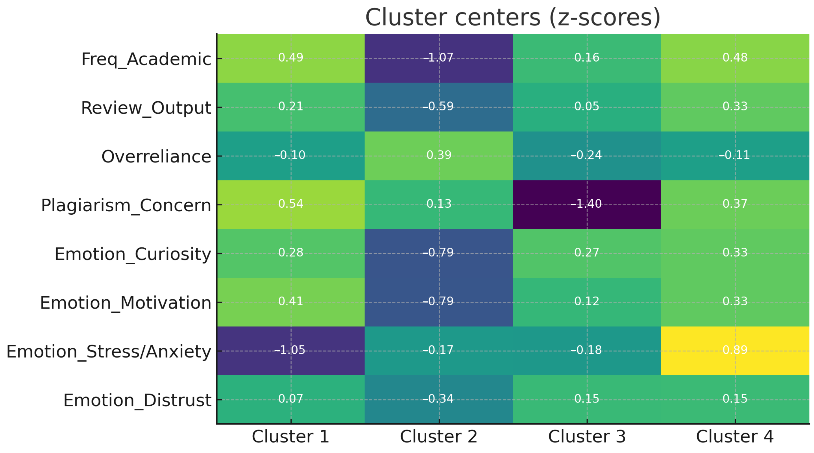 We selected variables reflecting frequency and purpose of AI use, self-regulation (revision and overreliance), ethical concern (plagiarism, impact on learning), and emotional responses (curiosity, motivation, stress, distrust). Prior to clustering, variables were standardized (z-scores) to ensure equal weighting.