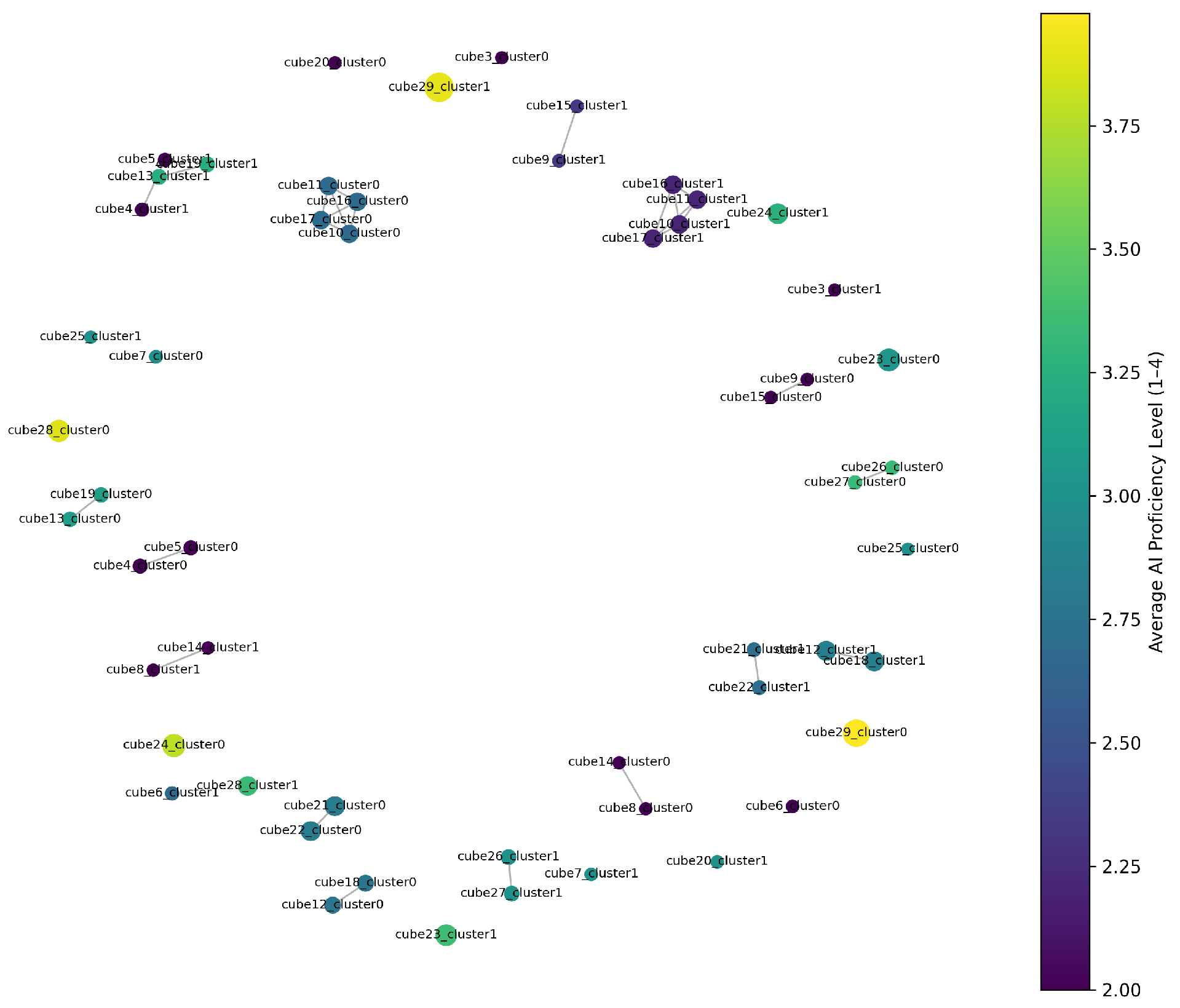 The optimal number of clusters was determined by examining the elbow criterion (inertia plot) and silhouette scores. Both criteria suggested that a solution with four clusters provided a proper balance between parsimony and interpretability. This choice is also consistent with theoretical frameworks distinguishing between low, medium, high, and advanced competency levels. Although the algorithm produced four clusters, in the interpretation of the results, we refer to them as profiles. This terminology tries to emphasize that the groups represent emergent patterns of AI use and competency rather than fixed categories or hierarchical levels. Using the notion of profiles allows us to highlight behavioral tendencies and educational implications, while avoiding the prescriptive connotations of terms such as “levels.”