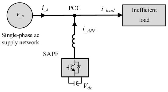 Two principal approaches may be considered for reducing the impact of harmonics on power quality: either by preventing their generation—through PWM modulation techniques aimed at selective harmonic elimination, thereby reducing the total harmonic distortion (THD) of the voltages and currents generated in power converters [11]—or by mitigating them using active power filters (APFs). APFs have proven to be effective tools for improving electrical power quality [10,11,12,13]. Among these, shunt APFs (SAPFs) operate as controlled current sources [14] connected in parallel with inefficient loads at the point of common coupling (PCC), as illustrated in Figure 1. SAPFs enhance power quality by compensating for inefficiencies generated by electrical loads, thereby preventing their propagation through the power grid. Additionally, APFs have been incorporated into power generation systems, particularly in renewable energy applications, where they contribute to both energy injection and the correction of inefficiencies [15,16,17].