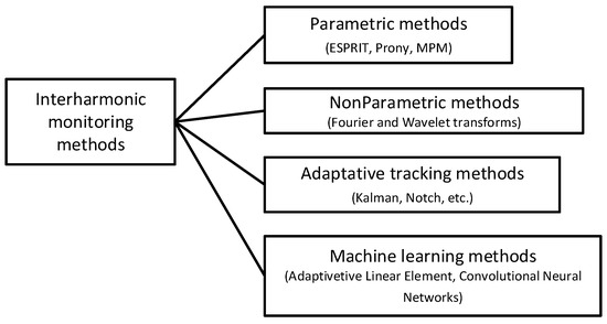Currently, multiple approaches are used for the identification of non-fundamental components in voltages and currents. However, interharmonic identification presents a particular challenge due to their frequencies not being integer multiples of the fundamental component. In [21], the authors present a classification of different interharmonic identification methods, while [22] summarizes these techniques into four major categories, as illustrated in Figure 2.