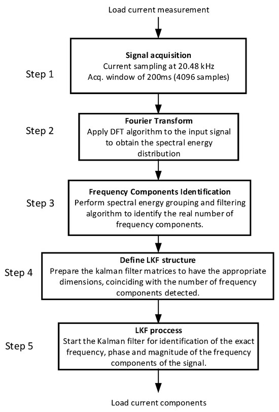 is the system state matrix, and it must match the system model. In the context of harmonic identification in the load current, properly sizing this matrix requires knowing the number of harmonic components. The accuracy of the estimation then depends on the LKF model [38]. The LKF will converge if the model includes a number of states equal to the harmonic components of the signal to be estimated.