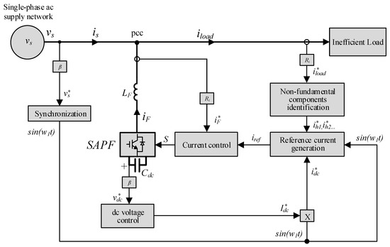 The load current can be expressed as in (14), comprising both fundamental and non-fundamental components. The SAPF current, defined in (15), enables full compensation of the non-fundamental components upstream of the PCC, while maintaining the dc-link voltage (Vdc) at its desired level through the current (idc), obtained using a dc voltage controller. This configuration allows for an enhancement of power quality indices such as THDi and power factor (PF).