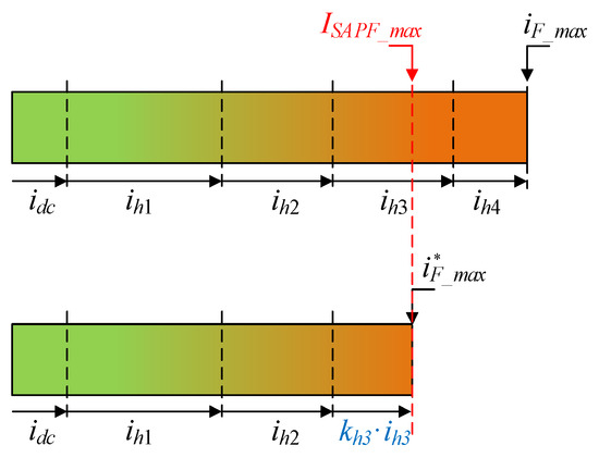 Representation of the selective compensation strategy showing the limitation imposed by the maximum SAPF current () and the resulting partial compensation of the less harmful components.