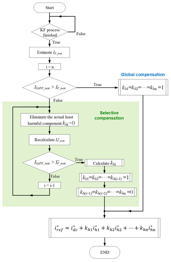 Flowchart of the reference current generation process, illustrating the transition from global to selective compensation according to the maximum allowable SAPF current.