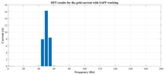 As in the preceding cases, to verify the effectiveness of the compensation achieved by the SAPF, a DFT of the compensated AC grid current is performed, followed by the grouping and filtering process. This results in the components shown in Figure 23. Using these values, the accurate magnitudes and frequencies were obtained with a properly dimensioned Kalman filter. The results confirmed the actual values of the AC grid current components: 32.5 A at 50.1 Hz, 2.98 A at 147.9 Hz, 1.06 A (63.6%) at 250.5 Hz, and 1.69 A at 300.7 Hz, as expected.