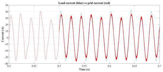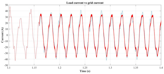 Load (blue) vs. ac grid (red) current with SAPF starting at 1.16 s.