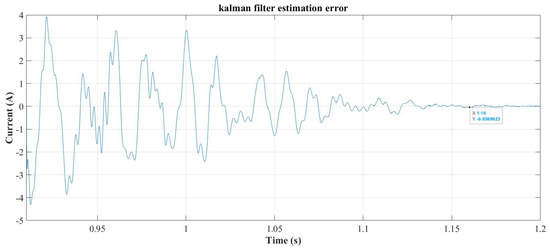 The Kalman filter estimation converges at 1.16 s as can be seen from the evolution of the error signal in Figure 21. At this time, the reference current forming algorithm is started again. For this case, the theoretical value of IF_max is 23.76 A and, has been fixed at 18 A—and so forcing a different case for selective compensation. The least harmful components have been chosen to be components 5, 9, and 8 in descending order. The reference current forming algorithm eliminates these components, meaning that the new maximum compensating current is reduced to 17.4 A. As a result, components 5 and 9 will not be compensated and component 8 is scaled to use the remaining current capability of the SAPF. The algorithm computes kh8, which in this case results in: