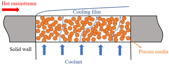 Numerous researchers have employed these three models to numerically simulate transpiration cooling effects [7,8,9,10,11,12]. Ding et al. [7] integrated transpiration and film cooling in separate porous matrices, utilizing the Brinkman–Forchheimer extension of the Darcy equation to model nitrogen flow through pores with an average diameter of 39 μm. In a subsequent study, Ding et al. [8] proposed a novel two-layer combined cooling configuration, consisting of an inner layer with discrete slots for localized coolant injection and an outer layer with a uniform porous matrix for enhanced coolant diffusion. Within the porous region, the coolant flow through randomly distributed pores was modeled using the Brinkman–Forchheimer-extended Darcy equation for momentum conservation and the local thermal equilibrium (LTE) model for energy balance. Xiao et al. [10] applied the Darcy–Forchheimer model along with a local thermal non-equilibrium model to numerically investigate transpiration cooling in a porous nose cone, analyzing liquid coolant behavior under transonic flow across varying enthalpy conditions. Their results demonstrate that coolant injection markedly influences the boundary layer structure. Similarly, Wu et al. [11] adopted the Darcy–Brinkman–Forchheimer equation to characterize fluid flow in the porous region, showing that coolant distribution in the leading and trailing edge regions significantly affects the development of the blade flow boundary layer and overall cooling performance.