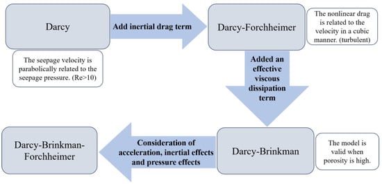 It is challenging to characterize the internal structure of a porous medium using a standard mathematical model due to its extreme complexity and the typically disorganized and unpredictable spatial distribution of its skeleton and pores [1,2]. The Darcy model [3] remains the foundation for current theoretical models of fluid seepage in porous media. These models have been continuously updated and expanded, culminating in the development of the widely used Darcy–Brinkman–Forchheimer model, as depicted in Figure 2.