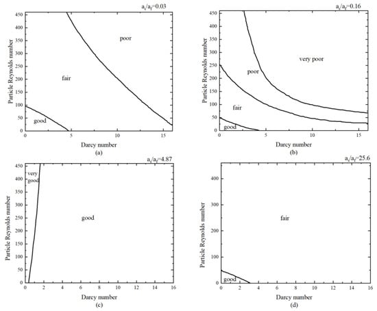 A comparative analysis of the predictions from the local thermal equilibrium (LTE) and local thermal non-equilibrium (LTNE) models has been conducted by several researchers [34,36]. Vafai and Sozen [34] highlighted a critical limitation: LTE models may yield inaccurate results when applied to porous media flows. Furthermore, the assumptions underlying the LTE model were found to be invalid under conditions of high Reynolds and high Darcy numbers [36]. Subsequent studies have examined non-Darcy flow phenomena, incorporating the effects of thermal dispersion and exponential porosity variations under LTNE conditions. To guide model selection, error plots illustrating the applicability ranges of various simplified assumptions for specific working conditions were developed. The suitability of the LTE assumption is quantitatively determined by the local temperature difference at each grid point, defined as . The LTE assumptions are classified as “good” if %LTE < 1%, “very good” for 1–5%, “fair” for 5–10%, “poor” for 10–15%, and “very poor” if exceeding 15%. These results are presented graphically in Figure 3.