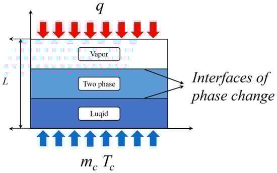 A fluid at temperature Tc and with a mass flow rate mc enters the pore from the outside. It absorbs heat from the porous matrix until it undergoes a phase transition, generating vapor before exiting. Based on the fluid state, the porous matrix is divided into three distinct zones: the liquid zone, the liquid-vapor mixing zone, and the vapor zone. For such two-phase flow problems, three models are commonly employed to characterize the flow, heat transfer, and phase change: the standard-pore model (SPM), the two-phase mixture model (TPMM), and the more recently developed semi-mixed model (SMM). All three models are formulated under the assumption of local thermal non-equilibrium (LTNE) to account for heat exchange between the fluid and solid matrix within the pores. Consequently, each model comprises two energy conservation equations—one for the fluid phase and another for the solid phase.