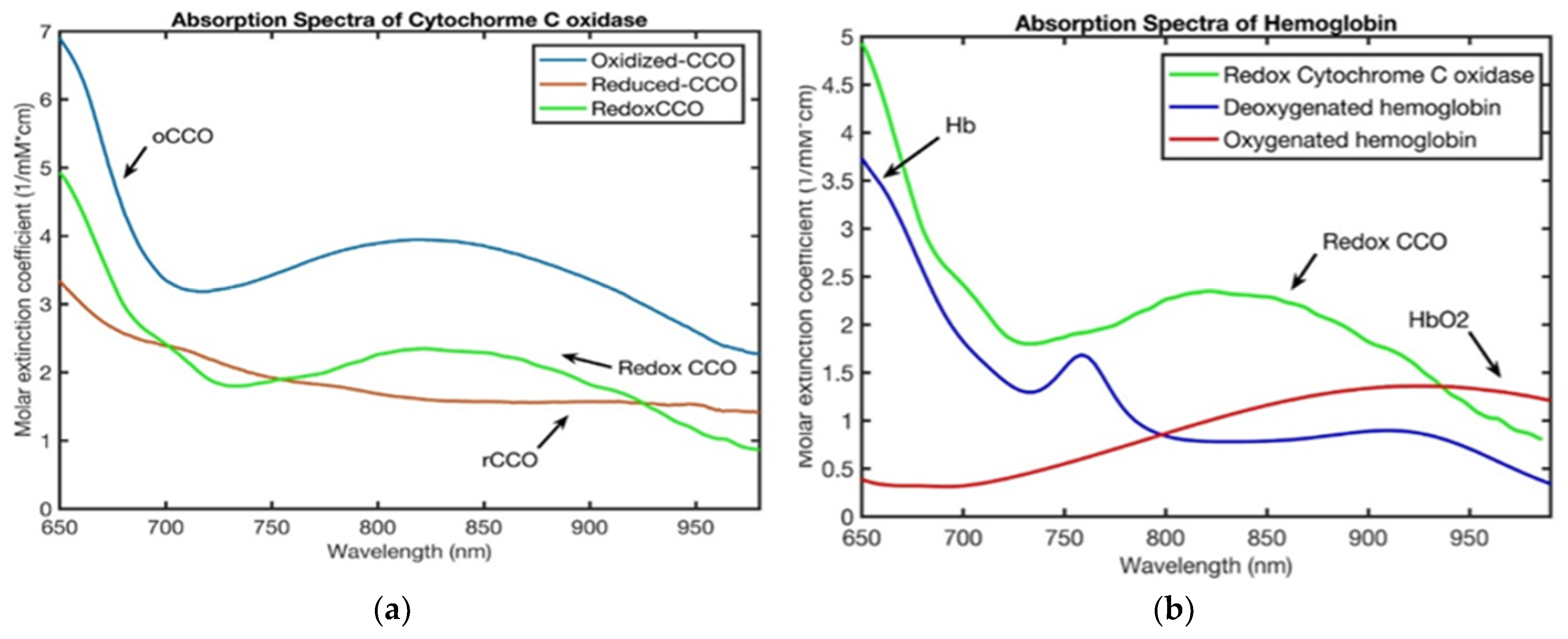 - Eskandari, R. Quantification of oxidized and reduced cytochrome-c-oxidase by combining discrete-wavelength time-resolved and broadband continuous-wave near-infrared spectroscopy. Biomed. Opt. Express 2025, 16, 3797–3812. [Google Scholar] [CrossRef]
