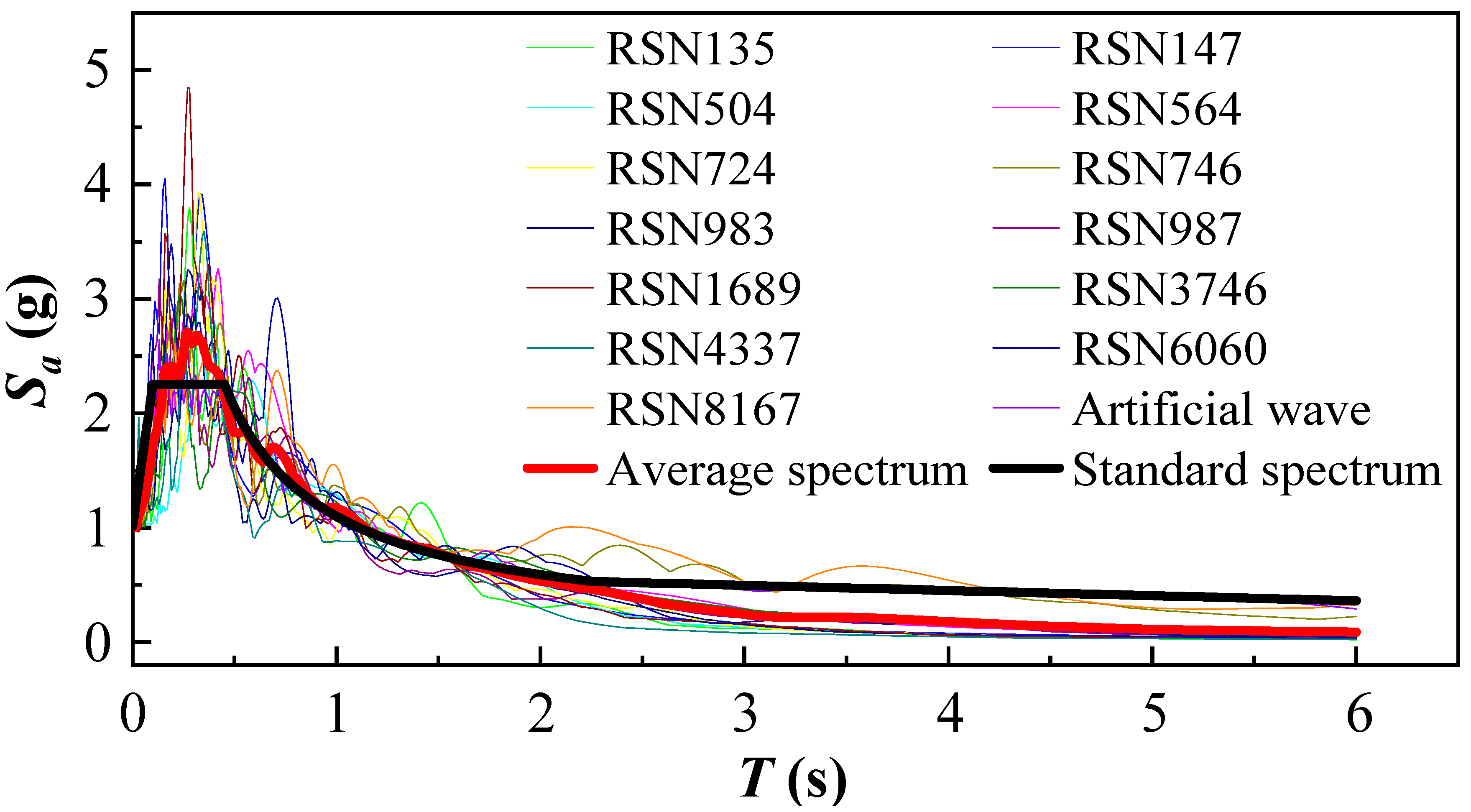 Table 3, two measured seismic waves and one artificial wave (measured waves accounting for 2/3) were selected, and adjusted the PGA to 0.1 g. The acceleration curves and Fourier spectra of the input seismic waves are shown in