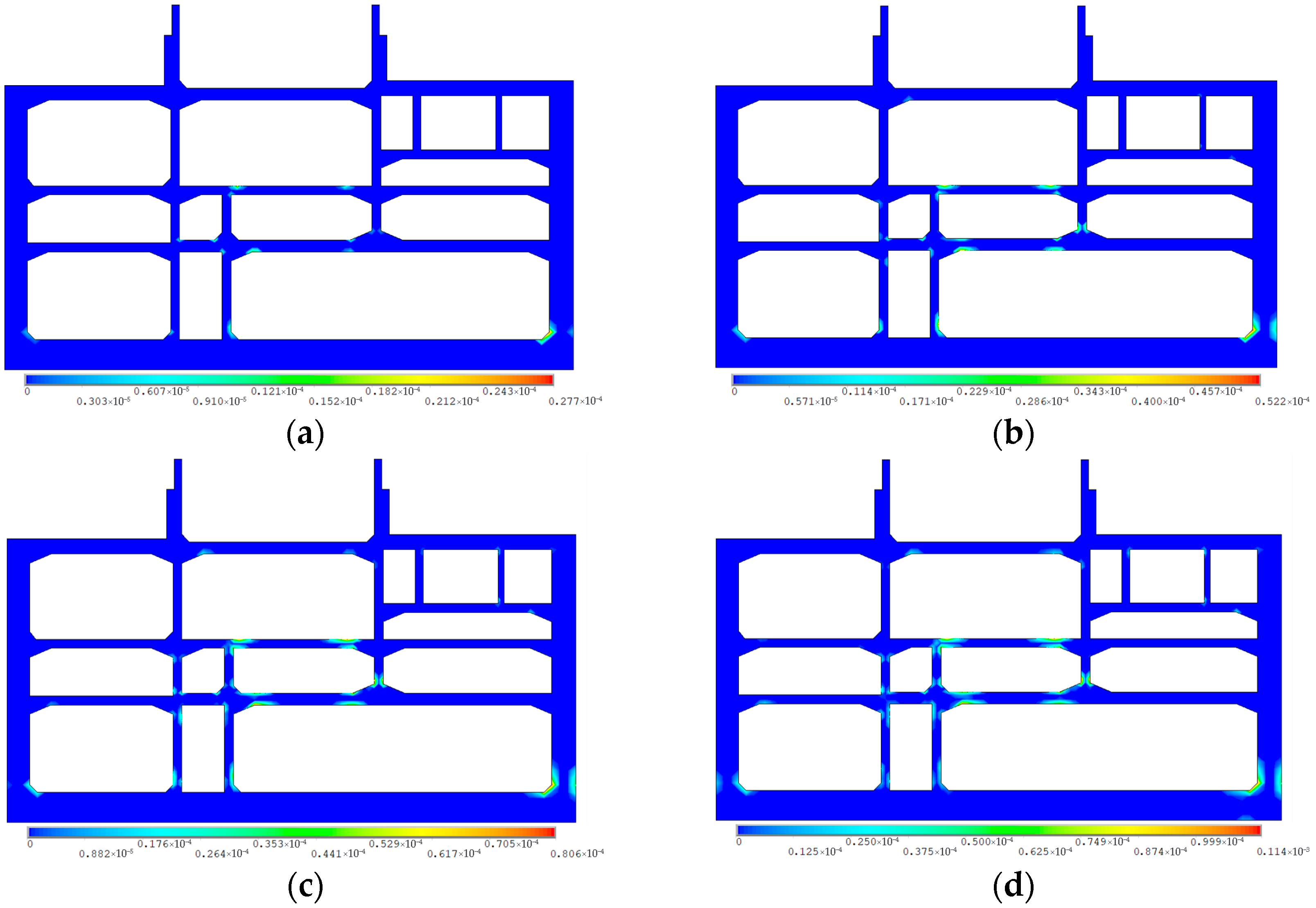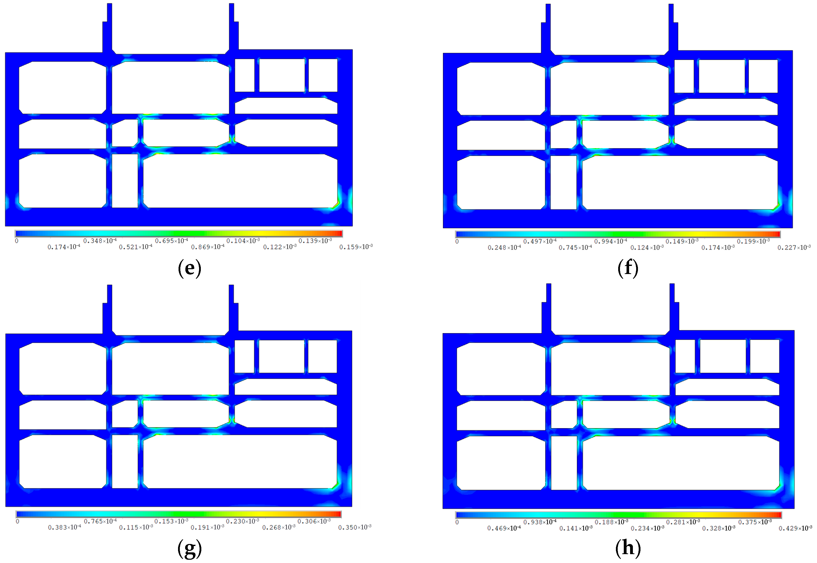 The development of damage exhibits a distinct three-stage characteristic. Under low-intensity ground motion (0.1 g to 0.2 g), the overall structure remains largely intact, with minor damage occurring in localized areas. The damage is primarily concentrated on the side walls, the bottom of the central wall, and near monitoring points #7, #8, #12, and #13. Under moderate-intensity earthquakes (0.3 g to 0.5 g), the damage area significantly expands, forming distinct plastic hinges at critical nodes. Moderate damage occurs in some areas (such as the structure base plate and right side wall), but overall stability remains relatively good. Under high-intensity earthquakes (0.6 g to 0.8 g), the damage area continues to expand, with critical components experiencing severe plastic deformation. The weak points of the underground interchange structure (the frame structure formed by monitoring points #7, #8, #12, and #13 and the bottom of the right-side wall) are severely damaged, potentially leading to structure failure. Damage intensifies at earthquake intensities of moderate strength or higher. At an earthquake intensity of 0.1 g, the maximum plastic strain of the structure is 2.77 × 10−5. When the earthquake intensity increases to 0.8 g, the maximum plastic strain of the structure is 4.29 × 10−4, approximately 15.5 times that at 0.1 g.