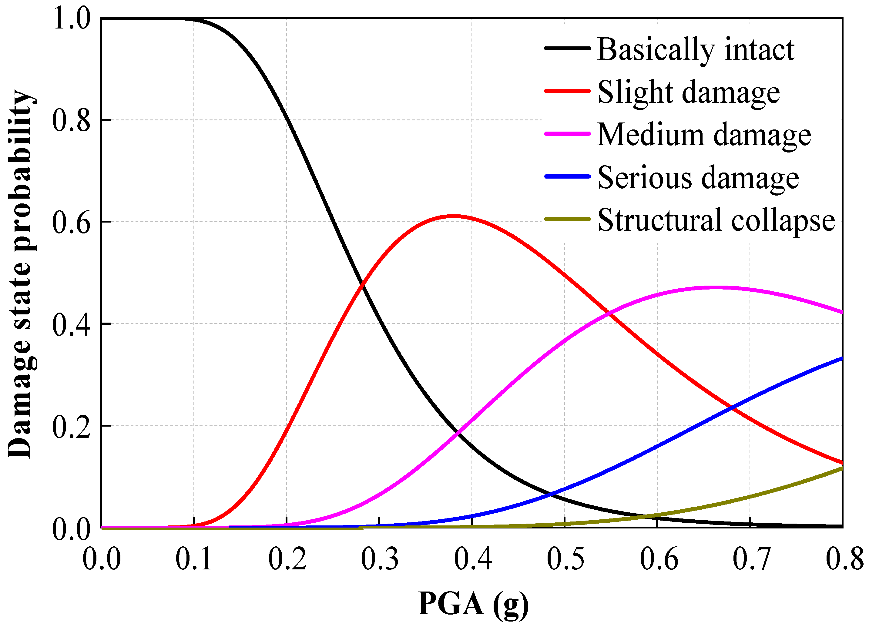 Figure 11 shows the probability distribution characteristics of structure damage states under different earthquake intensities. The curve for the structurally intact state exhibits a clear monotonically decreasing trend, indicating that as earthquake intensity increases, the probability of the structure remaining intact gradually decreases. In contrast, the curves for minor and moderate damage states exhibit typical non-monotonic variation characteristics, with probability values first showing an upward trend, reaching a peak, and then gradually decreasing. Notably, the curves for severe damage and structure collapse exhibit a sustained monotonous increase, clearly reflecting the significant rise in the probability of such extreme damage states occurring as earthquake intensity increases.