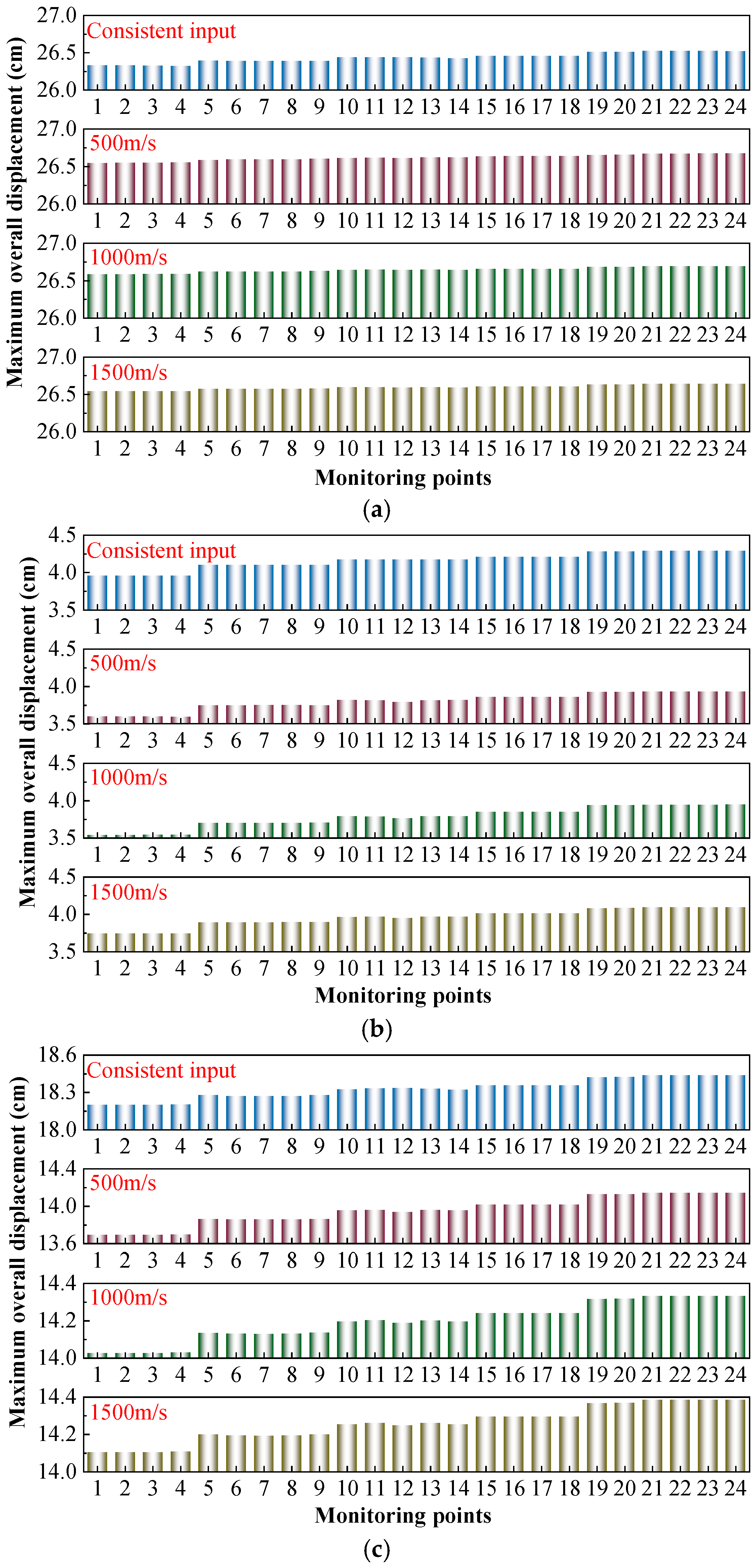 Under the influence of the RSN746 wave, the displacement magnitude of the monitoring points remains relatively stable within the propagation speed range of 500 to 1500 m/s, with fluctuations less than 5%. When the input is consistent, the maximum displacement is concentrated at 26.32 to 26.53 cm. The RSN983 wave exhibits different characteristics, with an increase in propagation speed leading to an overall decrease in displacement, with a reduction of 15 to 20%. The displacement range under consistent input is 3.95 to 4.29 cm. Artificial waves are most significantly affected by the traveling wave effect, with displacement decreasing by 28% at a propagation speed of 500 m/s compared to consistent input, but recovering by approximately 18% when the speed increases to 1500 m/s.