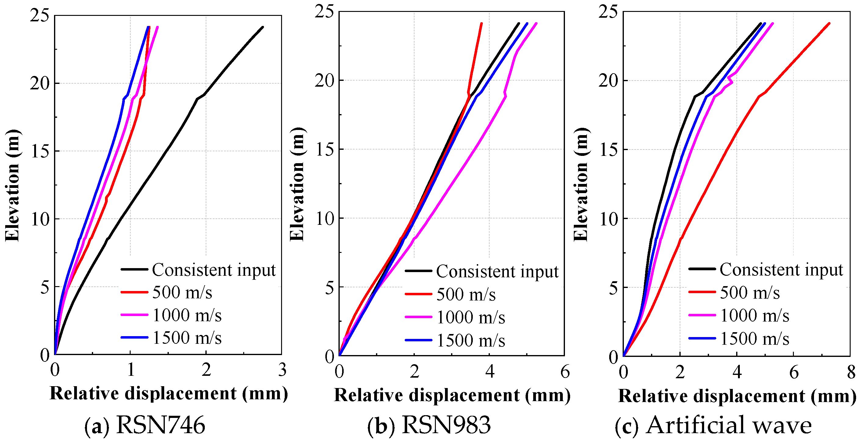 (2) In terms of overall displacement, the displacement value of the consistent input condition is generally larger than that of the traveling wave input, and the displacement change in the lower half of the structure (monitoring points #1 to #9) is more significant than that of the upper half (monitoring points #10–#24). In terms of relative displacement, different propagation velocities at elevations over 18.8 m caused a change in the trend of displacement growth, with the most obvious change under the condition of 500 m/s. The maximum relative displacement of the traveling wave effect during RSN983 wave action was 1.2 times that of the consistent input, and it could be up to 1.5 times that of the artificial wave action.