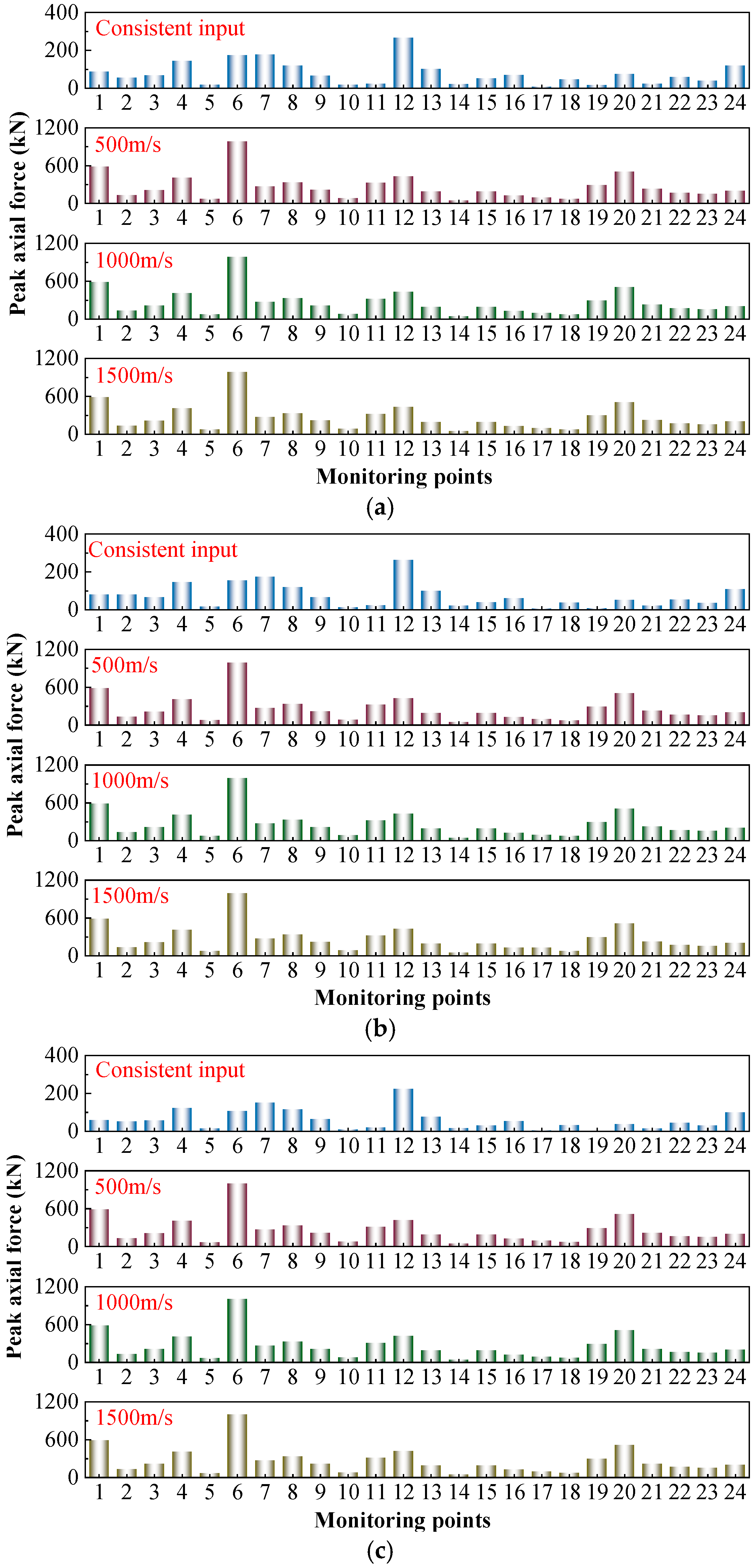 Figure 16, when the propagation speed increases to 500 m/s, the peak axial force significantly increases. Monitoring point #19 shows the largest increase (16.9 times), while monitoring point #24 shows the smallest increase (1.68 times). Under the 500 m/s condition, the axial force at monitoring point #6 reaches 983.7706 kN, indicating that this point is most prone to tensile-compressive failure. Monitoring points #7, #11, and #12 (mid-structure) within the same frame also exhibit high peak internal forces, indicating that this area is highly susceptible to damage. The axial forces at monitoring points #1 and #4 at the bottom of the side walls are 853.9005 kN and 406.4394 kN, respectively, significantly higher than those at other side wall monitoring points, suggesting that this area is prone to tensile-compressive failure.